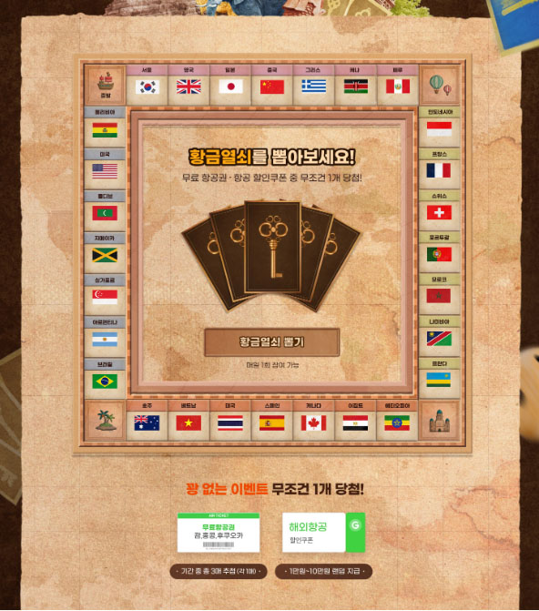 황금열쇠를 뽑아보세요! 꽝 없는 이벤트 무조건 1개 당첨! 이벤트 당첨 선물 괌, 홍콩, 후쿠오카 무료항공권_기간 중 총 3매 추첨 (각 1매) 해외항공 할인쿠폰_1만원-10만원 랜덤 지급 출발 서울 영